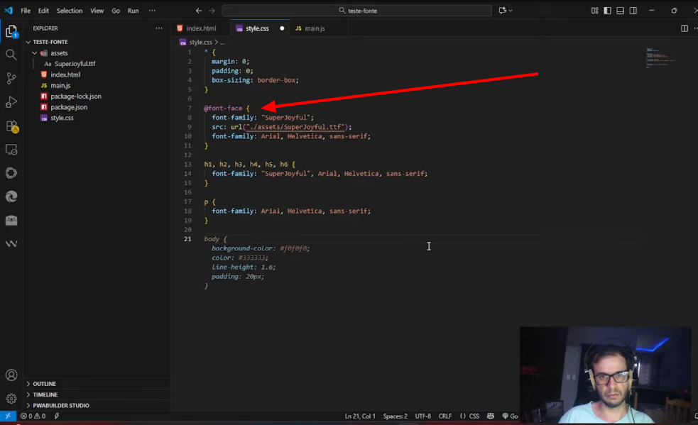 Para projetos desenvolvidos em código puro, o processo é bem direto. Você vai usar a regra @font-face no CSS para importar a fonte.