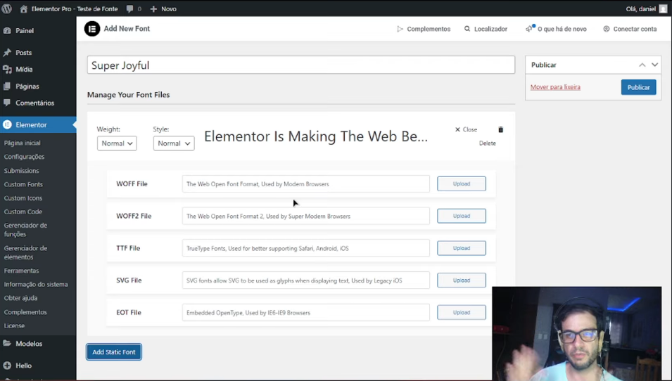 - No painel do WordPress, vá em Elementor > Custom Fonts