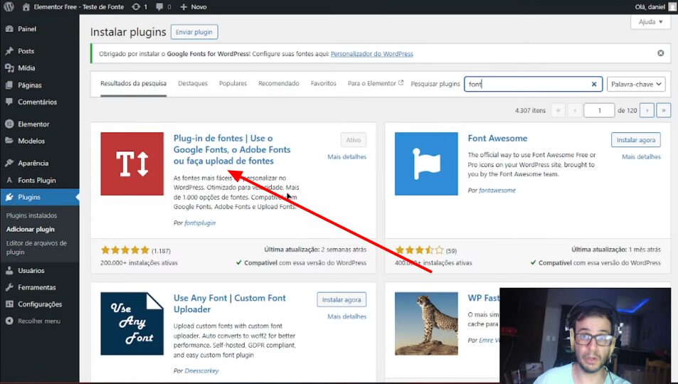 - Busque por “Fonts Plugin” ou “Custom Fonts”